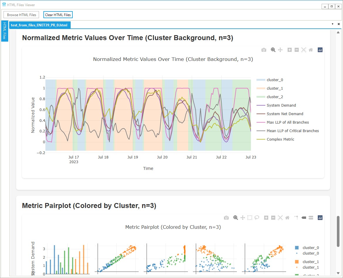 - Pairplot Matrix: A scatter plot matrix showing relationships between all pairs of metrics, with points colored by cluster assignment. This visualization helps understand how clusters group timesteps in the multi-dimensional metric space and reveals correlations between different metrics.